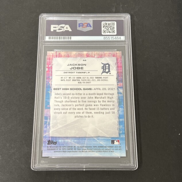 This listing features a 2022 Topps #44 Pink and Blue Refractor Jackson Jobe, professionally PSA authenticated.