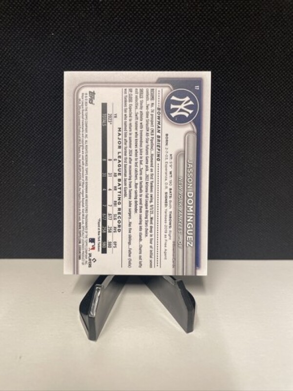 Get your hands on this rare and highly sought-after Jasson Dominguez 2024 Bowman #17 RC trading card. This card is a must-have for any serious collector or fan of the New York Yankees. Made from premium card stock material, this original Topps card features the talented rookie outfielder in his Major League Baseball (MLB) debut season.