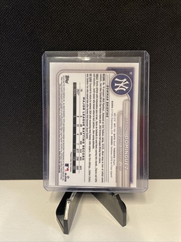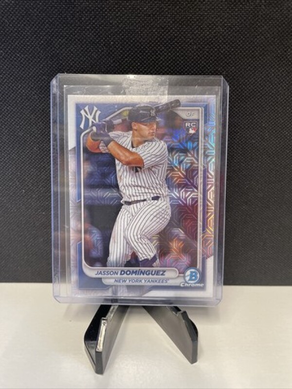 This is a rare and highly sought-after Mojo Refractor Rookie Card of Jasson Dominguez, card number 17 from the 2024 Bowman set. This card is an original Topps product made from premium card stock material, and features the young baseball player in his New York Yankees uniform.