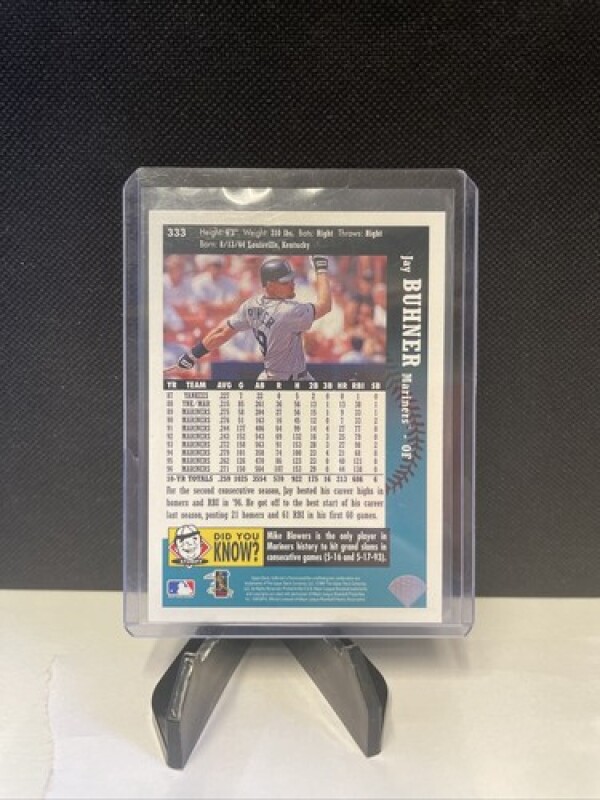 This Jay Buhner 1997 Collector's Choice Hot List #333 Ken Griffey Jr. trading card is a must-have for any Seattle Mariners fan. The card features a stunning image of the two players and is made of high-quality card stock. It is an original, licensed reprint from the 1997 Upper Deck Collector's Choice set and is in compliance with all Major League Baseball (MLB) standards.
