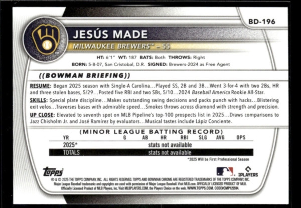 Jesus Made 2025 Bowman Draft Baseball Blue Border /150 Brewers #BD-196 (RC)