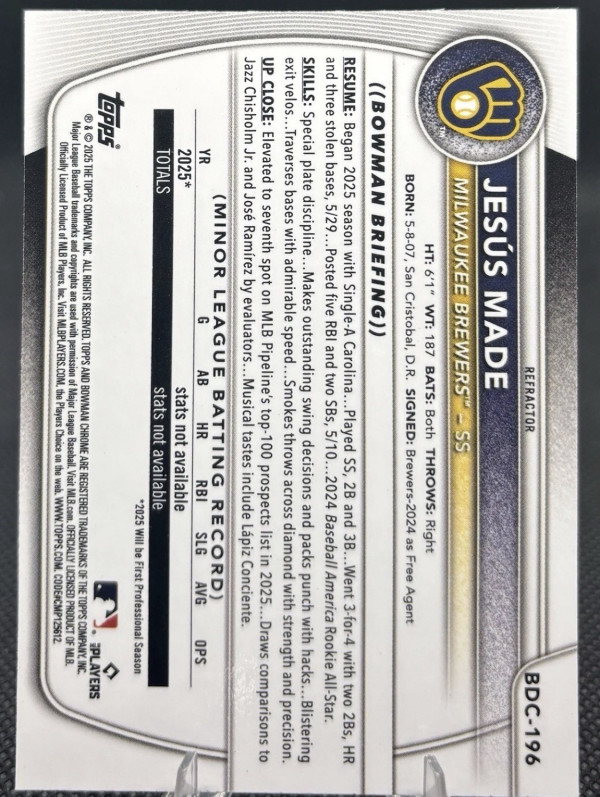 Jesus Made 2025 Bowman Draft Chrome Refractor Milwaukee Brewers #BDC-196