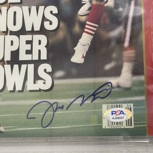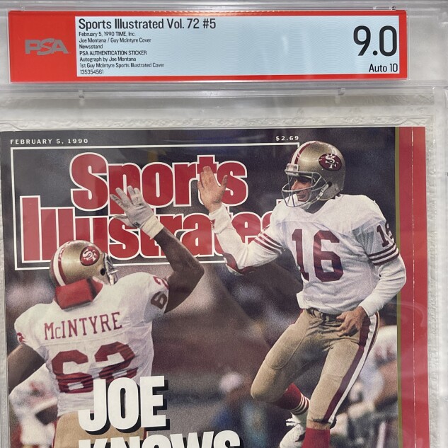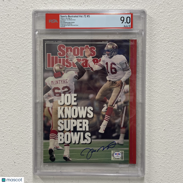 This listing features a Sports Illustrated Vol.72 #5 signed by Joe Montana, professionally authenticated and encapsulated by PSA.