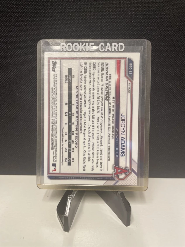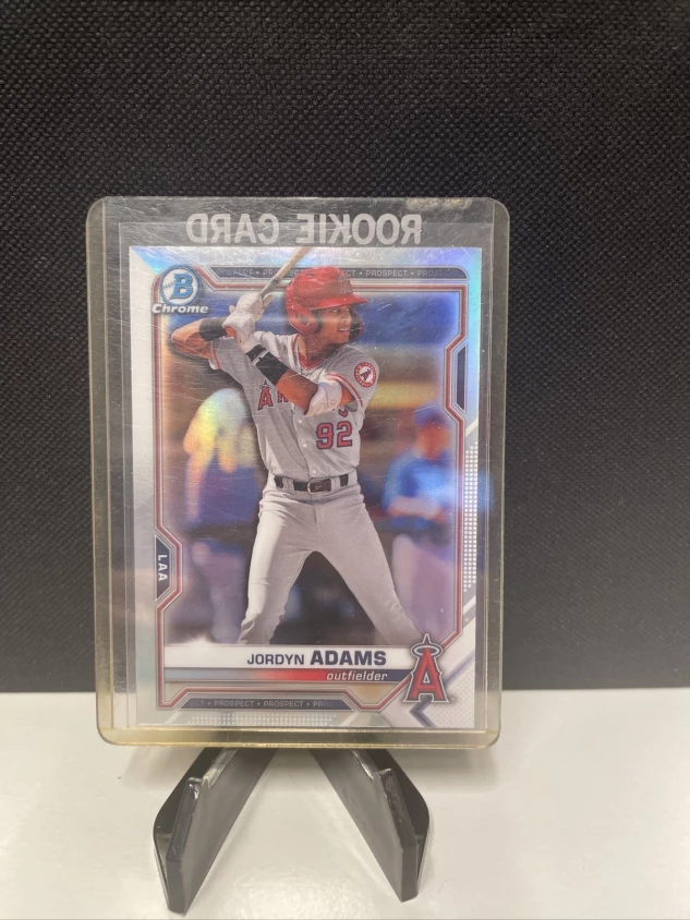 This is a Jordyn Adams 2021 Bowman Draft Baseball card, featuring a Chrome Refractor parallel/variety. The card is in the standard size and made of card stock material. This is an original, licensed card manufactured by Topps in the United States, and it belongs to the set of 2021 Bowman Draft. The card number is BDC-32 and it showcases the player/athlete as a member of the Los Angeles Angels in the Major League (MLB) for the 2021 season. The card is not autographed, nor does it have any vintage features.