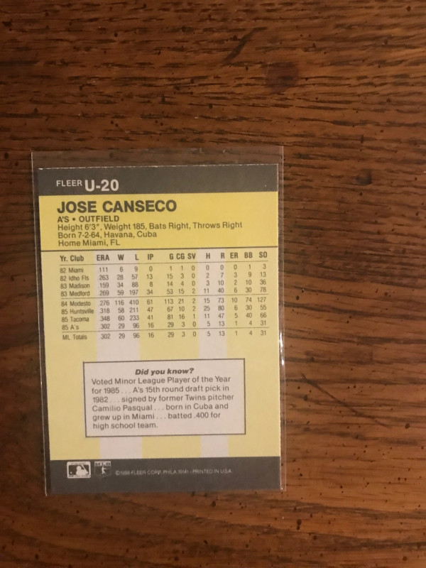 Jose Canseco 1986 Fleer Update. Mint Condition.