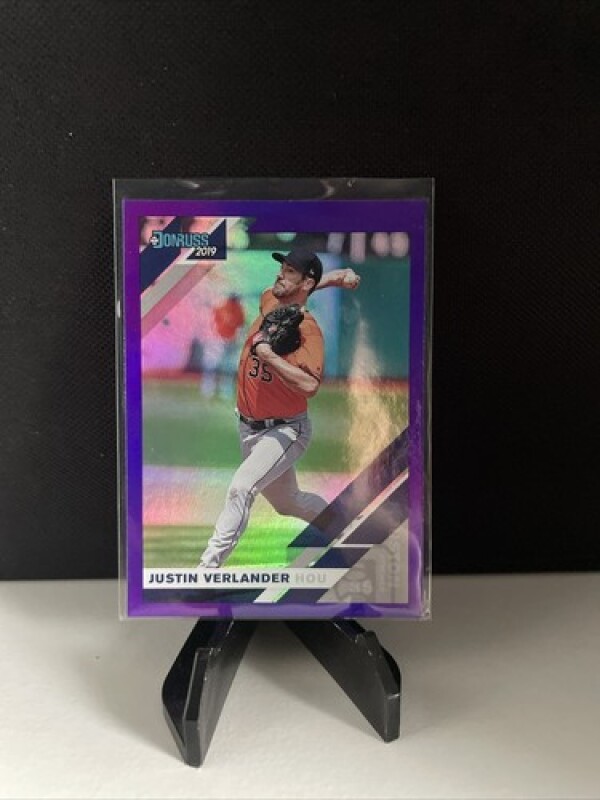This is a Justin Verlander 2019 Donruss #172 Purple sports trading card made of card stock. It features the Houston Astros player in a Major League (MLB) league setting. The card is an original and not a licensed reprint, manufactured by Panini in the United States.