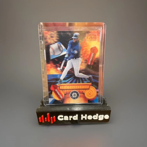The product is a 1995 Ken Griffey Jr. Sport Flix Detonators #DE3 trading card. This original card features the Seattle Mariners outfielder in a holographic design, part of the 1995 Sportflix set manufactured by Pinnacle. It is a standard-sized baseball card made of card stock, reflecting the Major League (MLB) season of 1995. This collectible item is a valuable piece for fans and collectors of sports trading cards, highlighting a talented player from the era.