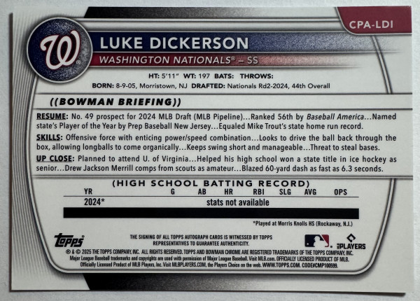 The product is a 2025 Bowman Chrome trading card featuring an autograph from MLB player Luke Dickerson. This speckle refractor version is numbered out of 299, making it a highly sought-after collectible for fans of baseball trading cards. The card is part of the Prospect Autographs Speckle insert set, showcasing the Washington Nationals player in his rookie year of 2025. It is a valuable addition for collectors looking to complete their set of sports trading cards.