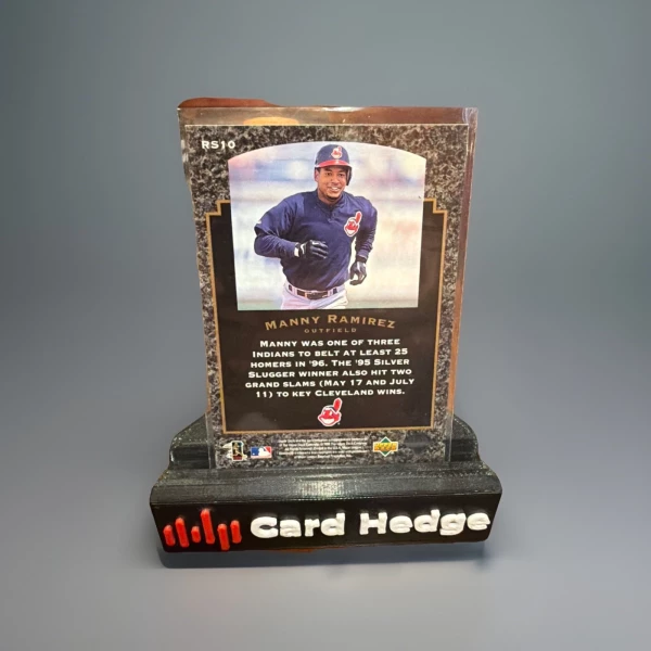 The product is a 1997 Upper Deck Rock Solid #RS10 trading card featuring Major League Baseball player Manny Ramirez. This original card is made of card stock and is part of the 1997 Upper Deck set. It is a standard size sports trading card with English text and is not autographed. The card showcases Ramirez during his time with the Cleveland Guardians in the 1997 season. It is a valuable collectible for baseball fans and card enthusiasts.