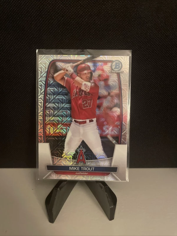 The card is a standard size and part of the 2023 set. It is a sports trading card and features a parallel variety with the Mega Box Mojo Refractor. The card is not autographed and is not considered vintage. It is a great addition to any collection for fans of Mike Trout or the Los Angeles Angels.