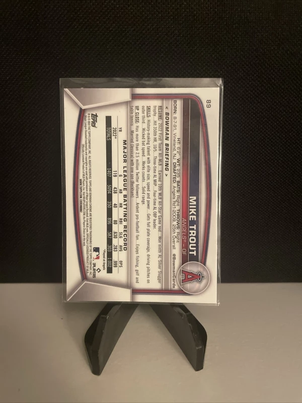 This 2023 Bowman Chrome Mega Box Mojo Refractor trading card features Mike Trout, a Major League Baseball player for the Los Angeles Angels. The card is made of card stock and is an original, not a reprint. The card number is #89 and it was manufactured by Bowman in the United States.