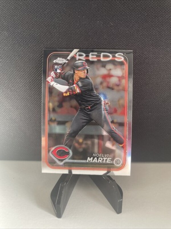 This is a 2024 Topps Chrome trading card featuring Noelvi Marte, a rookie player for the Cincinnati Reds in the Major League Baseball. The card is made of high-quality card stock material and has a standard size. It is an original card manufactured by Topps in the United States and is not autographed.