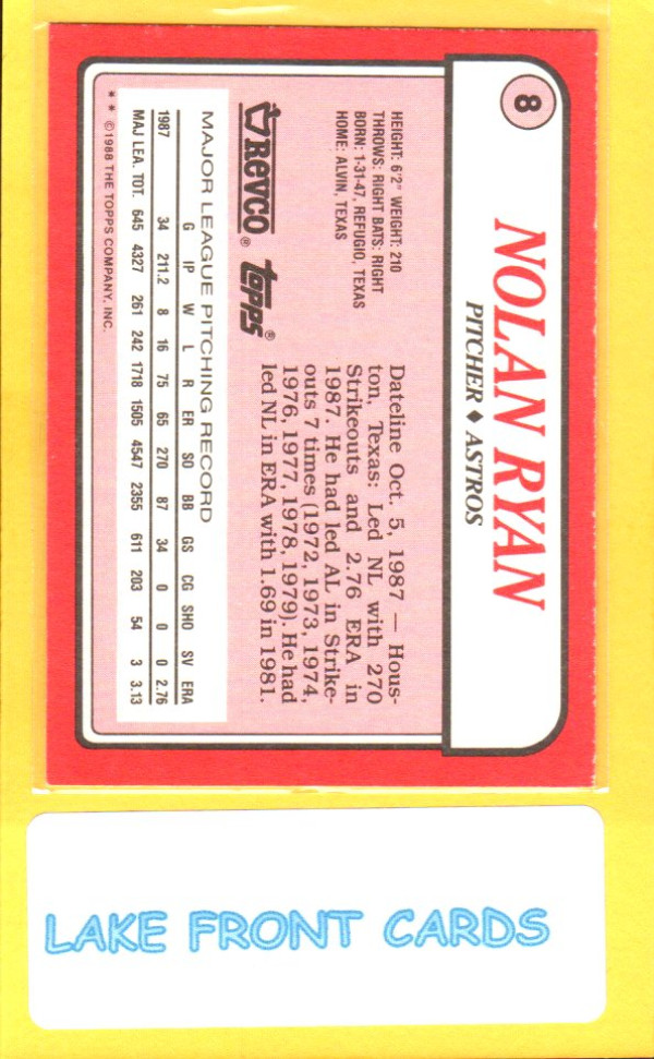 Dive into the history of baseball with the 1988 Topps Revco League Leaders Nolan Ryan card, a must-have for enthusiasts and collectors alike. Celebrating one of the most iconic pitchers of the time, this card is a tribute to Nolan Ryan's dominating presence on the mound for the Houston Astros.