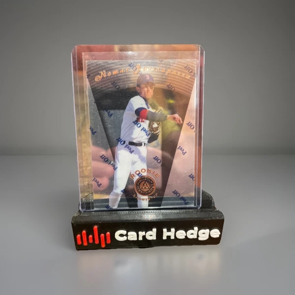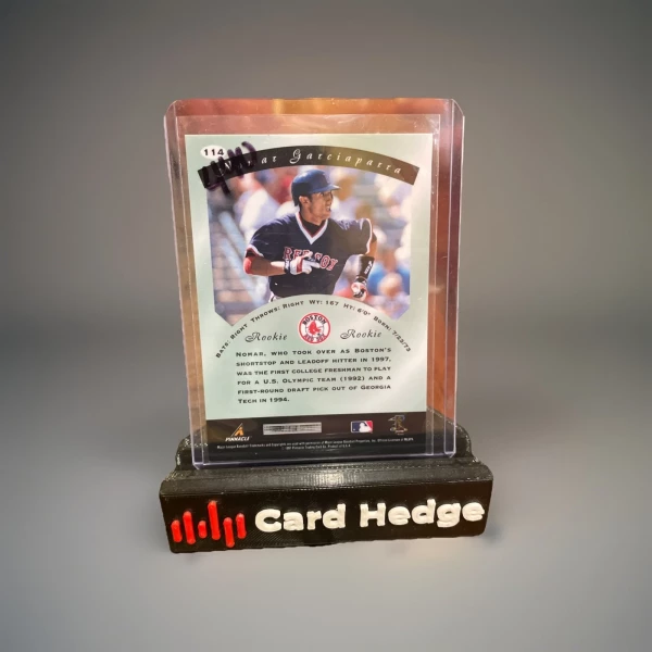 The product is a 1997 Pinnacle Certified Nomar Garciaparra Rookie Card #114. This baseball trading card features the player from the Boston Red Sox and is an original piece made of card stock. It is a standard-sized card in English language, part of the Major League (MLB) collection from the manufacturer Pinnacle. This collectible item is a valuable piece for fans and collectors of sports trading cards, specifically those interested in baseball and rookie cards.