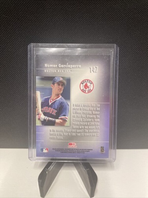This is a sports trading card featuring Nomar Garciaparra, a former Major League Baseball player for the Boston Red Sox. The card is made of card stock and is an original from the 1998 Donruss Elite set, with a card number of 147. It is a base set card with no parallel or variety. The card is in standard size and was manufactured in the United States. This card is perfect for any baseball fan or collector who wants to add a piece of sports history to their collection.