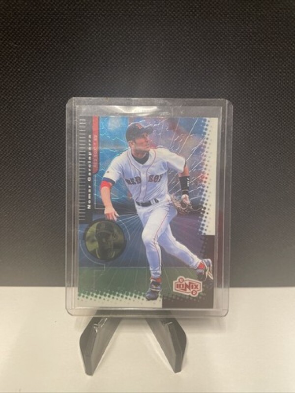 This sports trading card features Nomar Garciaparra, a former Major League Baseball player for the Boston Red Sox. It is an original 1999 Upper Deck Ionix card made of card stock material and part of the base set. The card number is 12 and it is a standard size.