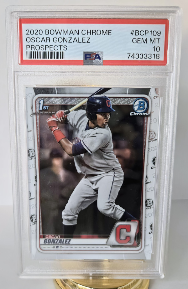 The product is a PSA 10 rated 2020 Bowman Chrome 1st Bowman Prospects trading card featuring baseball player Oscar Gonzalez of the Cleveland Guardians. The card is from the Chrome Prospects insert set by Topps, marking Gonzalez's rookie season in Major League Baseball. The card is a valuable collectible for fans and collectors of baseball trading cards.