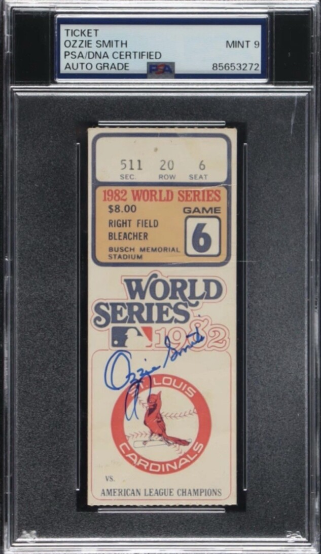 🔥🔥 Ozzie Smith Signed 1982 World Series Game 6 Ticket, PSA Auto 9
