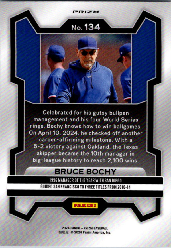 You are purchasing a Panini Prizm Bruce Bochy #134 Silver. You will receive the exact item in the photographs. Thank you for looking.