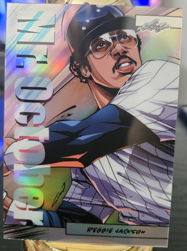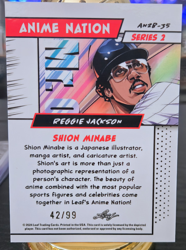 The product is a 2024 Leaf Anime Nation Series 2 trading card featuring Reggie Jackson of the New York Yankees. This card is part of a limited print run of 99 and is in near mint or better condition. It is a baseball sports trading card with a serial number and belongs to the base set of the series. As a highly collectible item, this card celebrates the iconic player in Major League Baseball history.