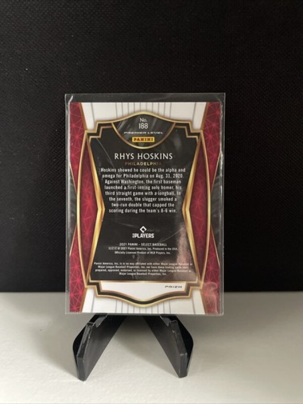 This is a stunning Rhys Hoskins 2021 Panini Select #188 Silver sports trading card. It features the Philadelphia Phillies player in a Major League (MLB) league setting, printed on high-quality card stock material. The card is an original and licensed reprint, with a silver parallel/variety that makes it stand out from the rest.