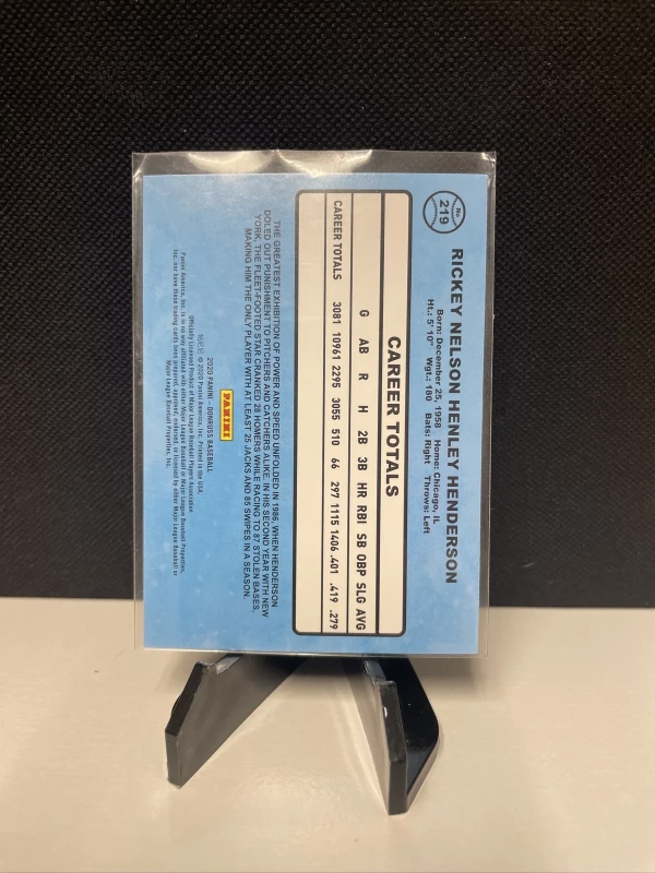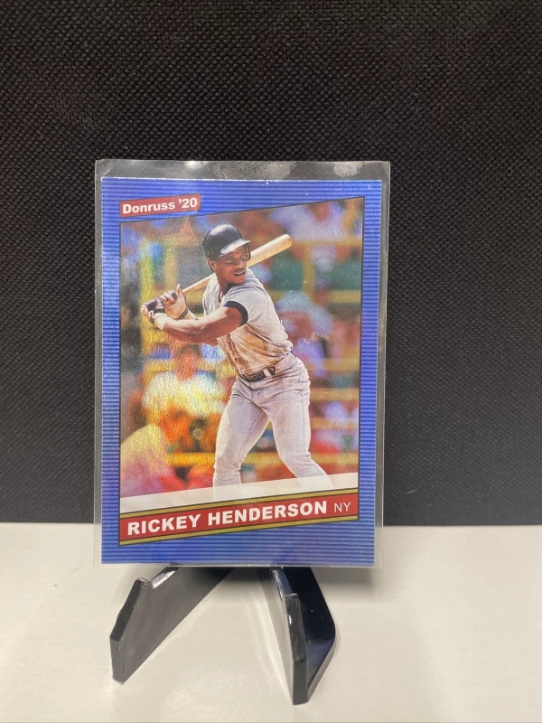 This 2020 Panini Donruss Retro '86 #219 Holo Blue card features baseball legend Rickey Henderson in his New York Yankees uniform. The holographic blue parallel version of this card makes it a unique addition to any sports card collection. The card is made of high-quality card stock and is an original, licensed reprint.