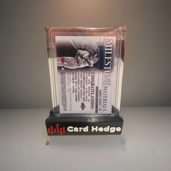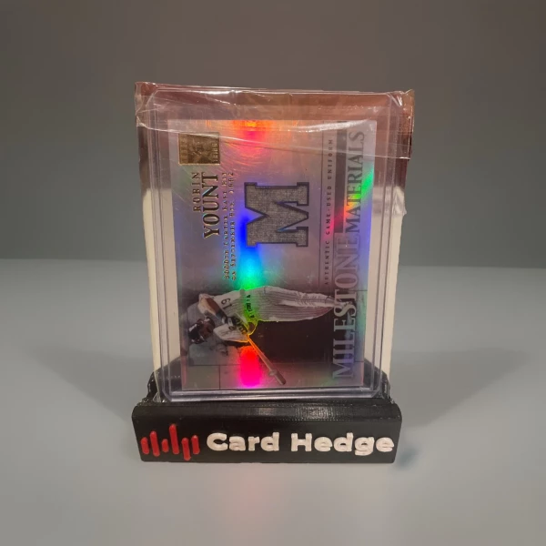 The Robin Yount 2002 Topps Pristine Milestone Materials #MIM-RY trading card is a standard-sized sports memorabilia card featuring a relic from the Hall of Famer's career. Manufactured by Topps in 2002, this English-language card is an original insert in the Topps Pristine set. The card showcases a piece of Robin Yount's milestone materials, making it a desirable collectible for fans of the Milwaukee Brewers and baseball memorabilia enthusiasts. With a focus on showcasing the player's career achievements, this card offers a unique and valuable addition to any sports trading card collection.