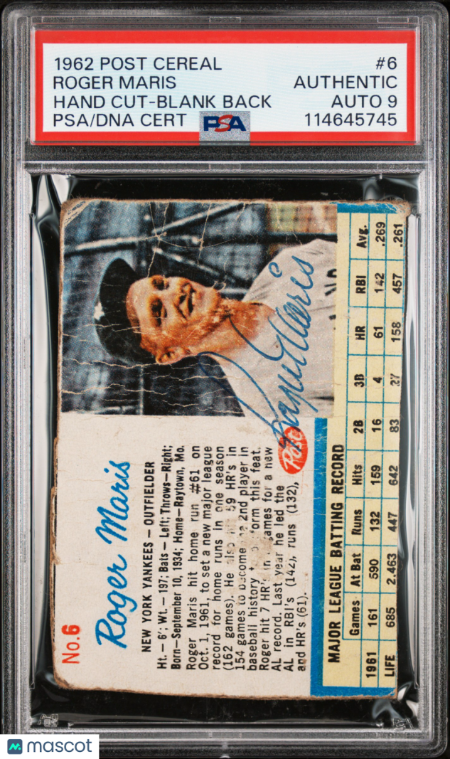 Roger Maris 1962 Post Cereal Hand Cut Blank Back#6 Signed Card PSA A Auto 9 Auto