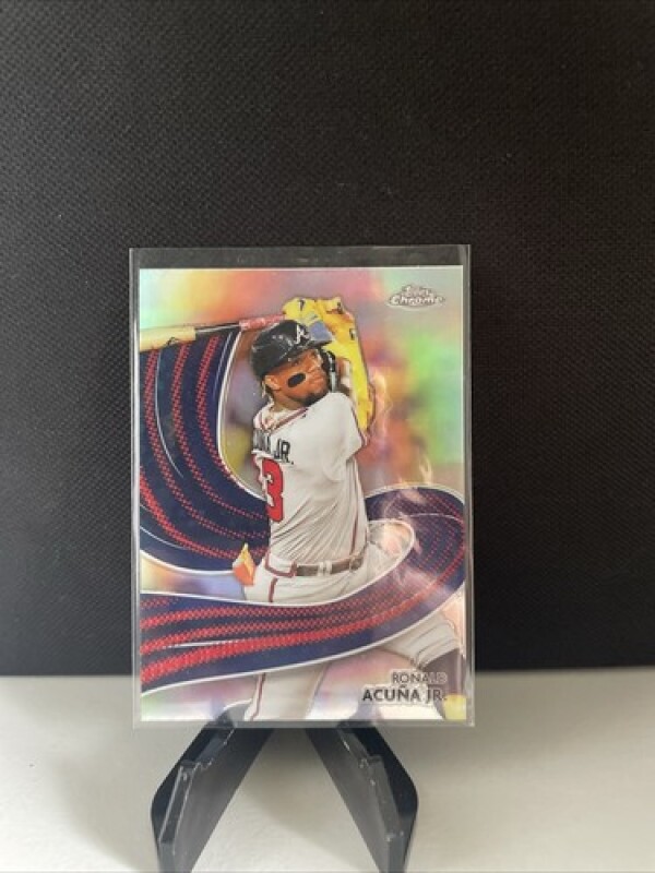 This 2024 Topps Chrome Strokes trading card features Major League Baseball player Ronald Acuna Jr. of the Atlanta Braves. The card is made of high-quality card stock and is an original, licensed reprint. It is part of the 2024 Topps Chrome set and has a card number of S-12.