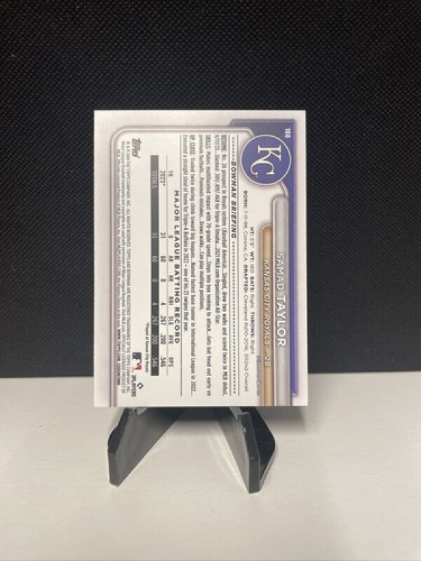 This is a Samad Taylor 2024 Bowman #100 RC sports trading card. It features the rookie card of the Kansas City Royals player and is made of card stock material. The card is an original, not a licensed reprint, and was manufactured by Topps in the United States.