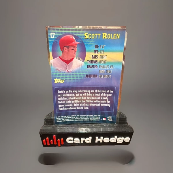 The product is a 1999 Topps trading card featuring Major League Baseball player Scott Rolen from the Philadelphia Phillies. This original card is part of the 21st Century Topps set and is made of card stock. It is a standard size card with English language text and belongs to the [Base] parallel/variety. The card is an insert and does not feature an autograph but is a valuable collectible for fans of baseball trading cards.