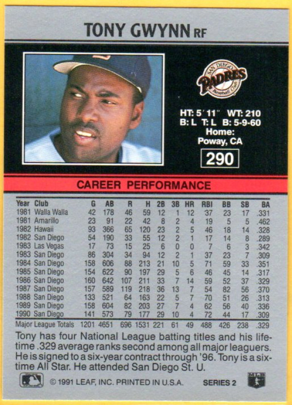 Tony Gwynn #290 – 1991 Leaf – San Diego Padres Legend