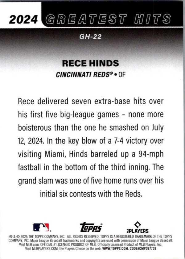 You are purchasing a Topps 2024's Greatest Hits Rece Hinds #GH-22 RC. You will receive the exact item in the photographs. Thank you for looking.