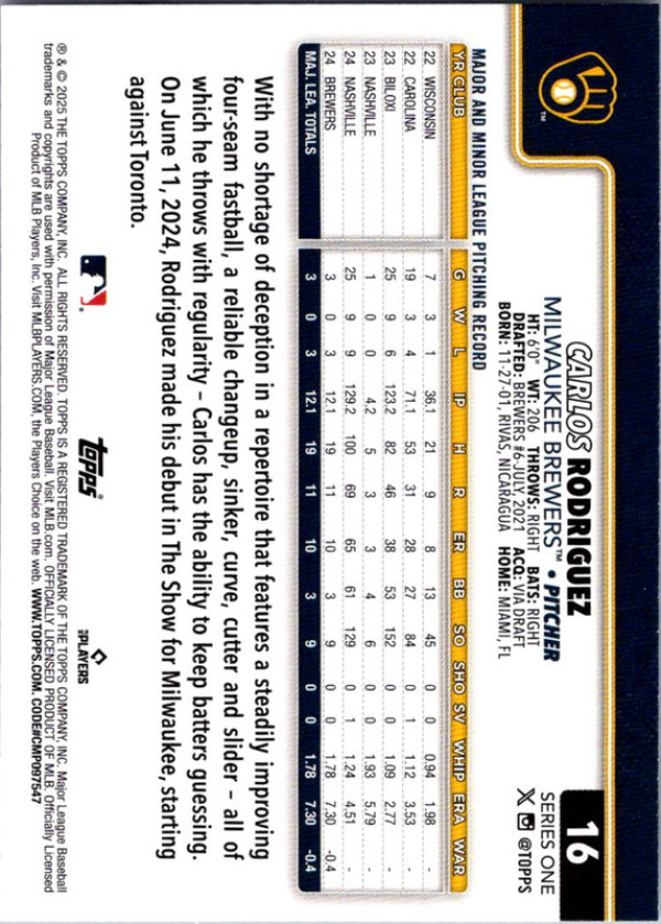 You are purchasing a Topps Carlos Rodriguez #16 RC. You will receive the exact item in the photographs. Thank you for looking.