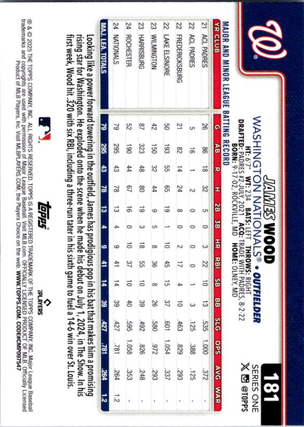 You are purchasing a Topps James Wood #181 RC. You will receive the exact item in the photographs. Thank you for looking.