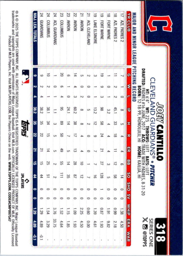 You are purchasing a Topps Joey Cantillo #318 RC. You will receive the exact item in the photographs. Thank you for looking.