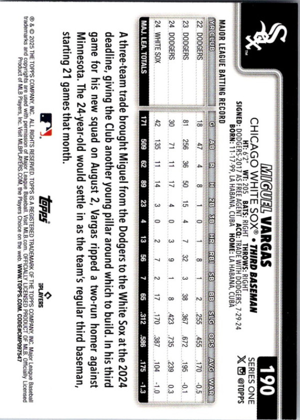 You are purchasing a Topps Miguel Vargas #190 Cactus. You will receive the exact item in the photographs. Thank you for looking.
