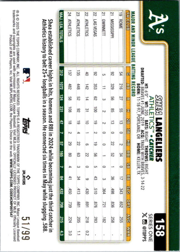 You are purchasing a Topps Spring Training Green Foilboard Shea Langeliers #158 51/99. You will receive the exact item in the photographs. Thank you for looking.