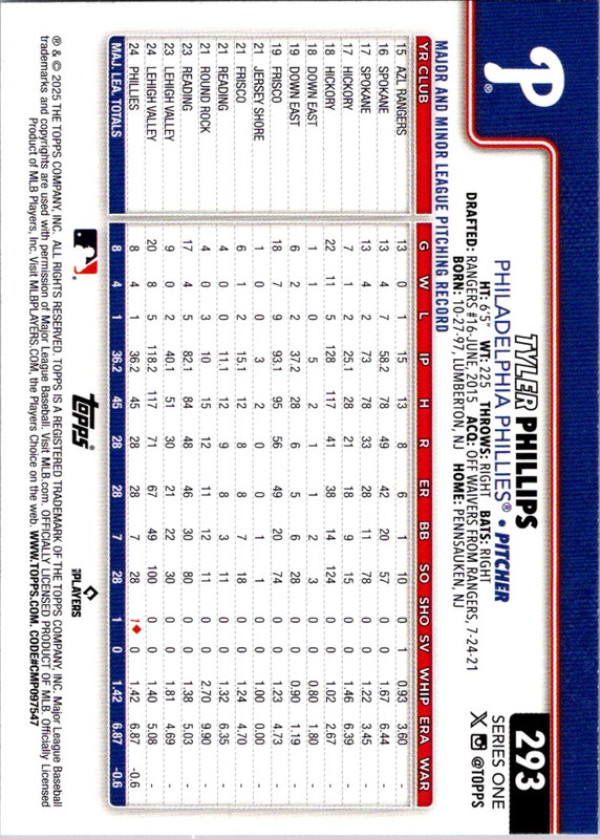 You are purchasing a Topps Tyler Phillips #293 RC. You will receive the exact item in the photographs. Thank you for looking.