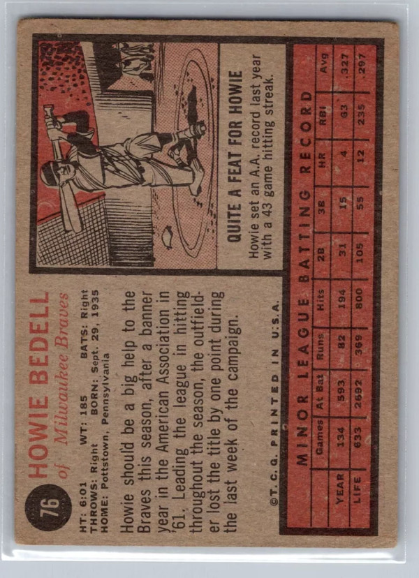 Vintage 1962 Topps Baseball - #76 Howie Bedell - Braves - VG