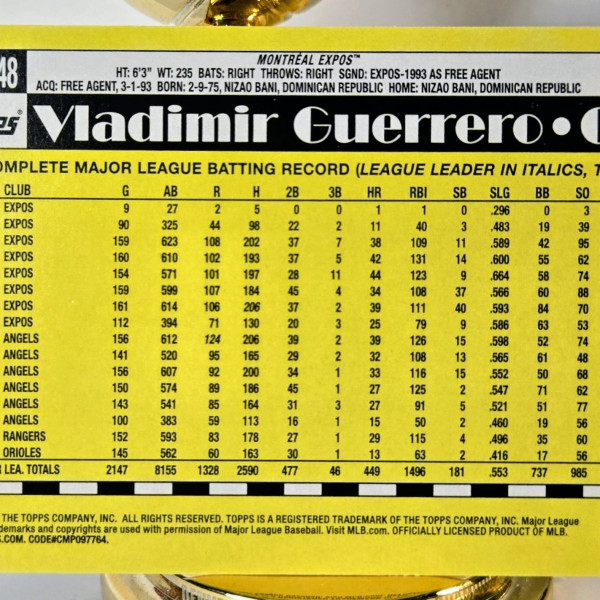 The product is a 2025 Topps Series 1 trading card commemorating the 35th anniversary of Vladimir Guerrero as a member of the Montreal Expos. This baseball card, featuring set number T90-48, is part of the 1990 Topps Baseball insert set for the 2025 season. Manufactured by Topps, this card showcases Guerrero as a standout player in Major League Baseball. A collectible item for fans of the Montreal Expos and baseball enthusiasts alike, this card celebrates the legacy of a legendary athletic figure.