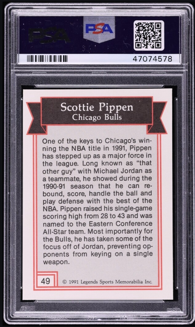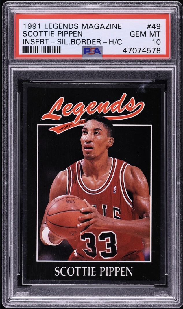 The product is a 1991 Legends Magazine Insert featuring Scottie Pippen of the Chicago Bulls with a silver border. This vintage sports trading card is hand cut from card stock and professionally graded as a PSA 10 by Professional Sports Authenticator. It is an original insert from the National Basketball Association (NBA) season of 1991, making it a highly sought-after collectible among basketball fans and collectors.