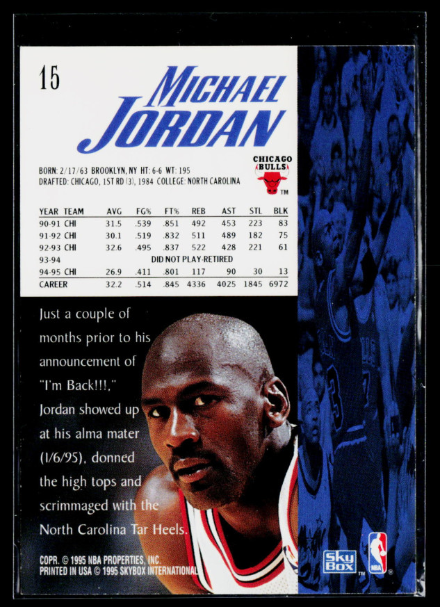 You are purchasing a 1995 SkyBox Michael Jordan #15. You will receive the exact item in the photographs. Thank you for looking.