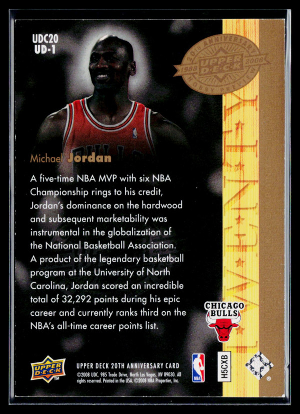 You are purchasing a 2008 Upper Deck 20th Anniversary Michael Jordan #UD-1. You will receive the exact item in the photographs. Thank you for looking.