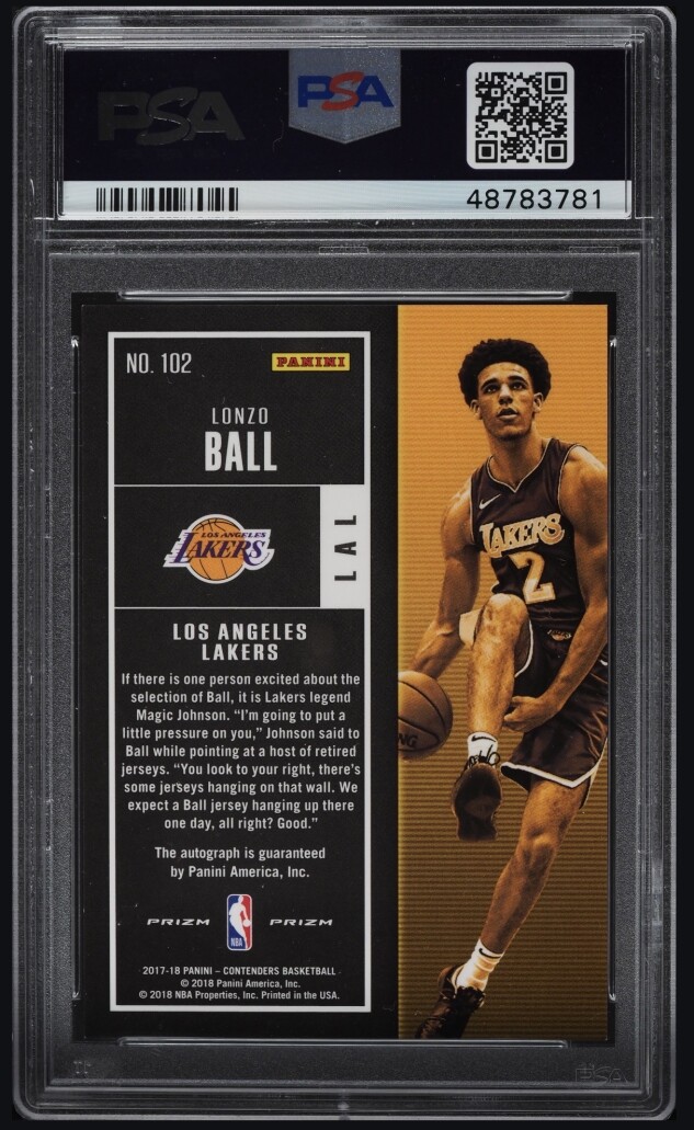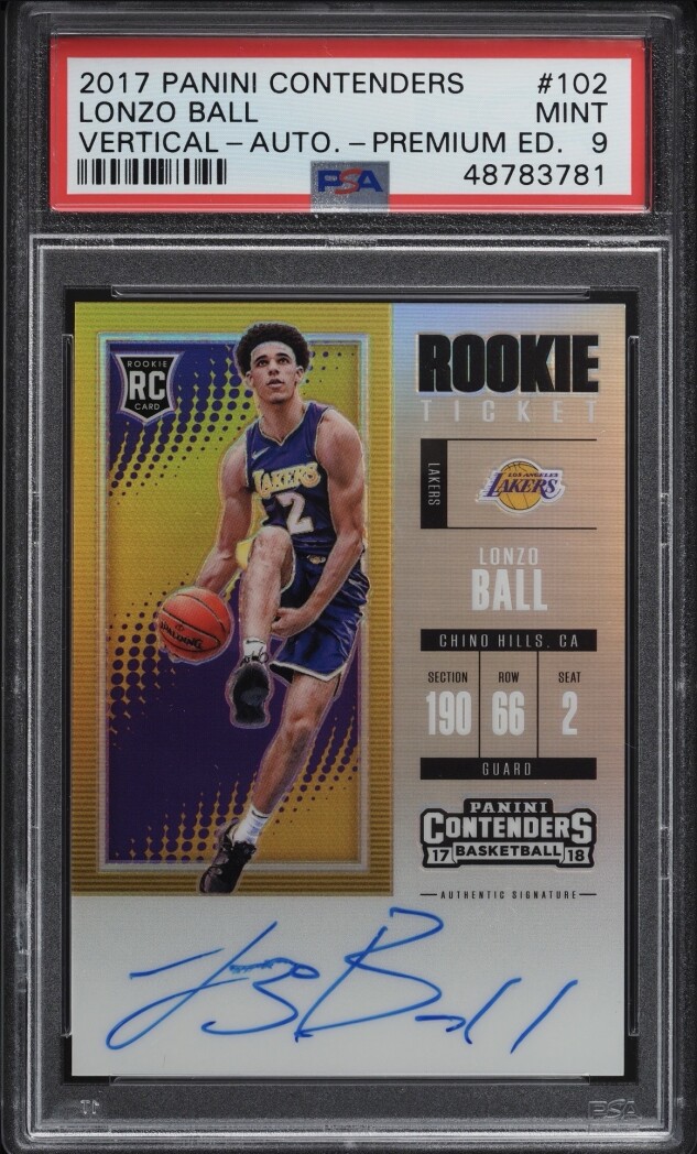 The 2017 Panini Contenders Premium Edition Lonzo Ball ROOKIE AUTO #102 is a highly collectible sports trading card featuring an autograph from the NBA player Lonzo Ball. This card is graded as a PSA 9 MINT, ensuring its authenticity and quality. Made of card stock with a hard-signed autograph, this original card is a valuable addition to any basketball memorabilia collection. As a rookie card signed by the player himself, this item is a sought-after piece for fans and collectors alike, especially those who support the Los Angeles Lakers.