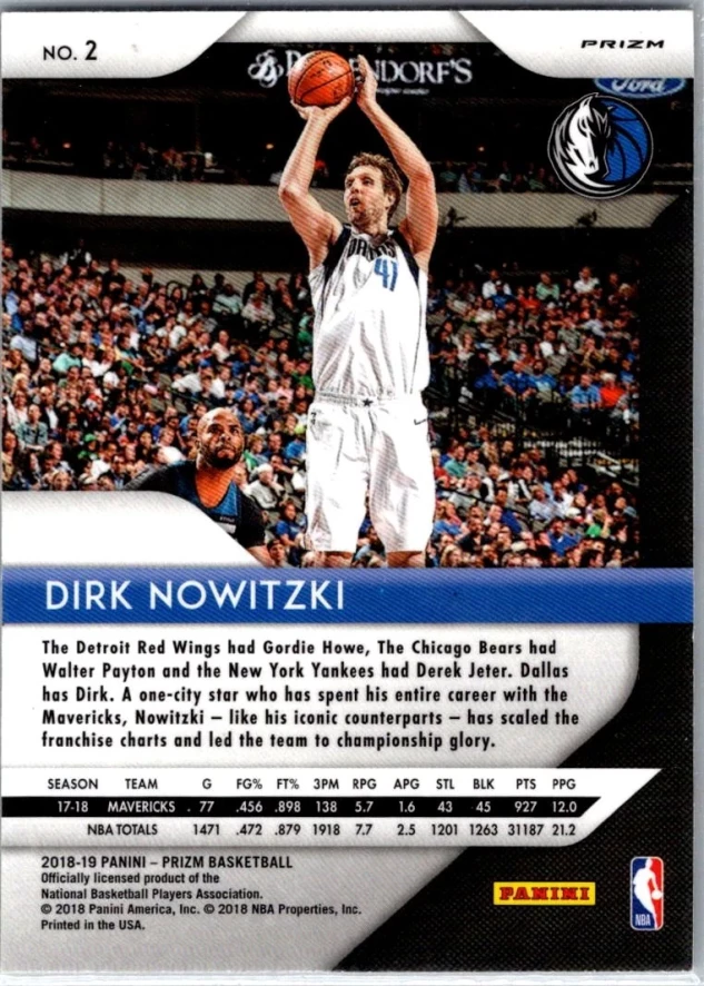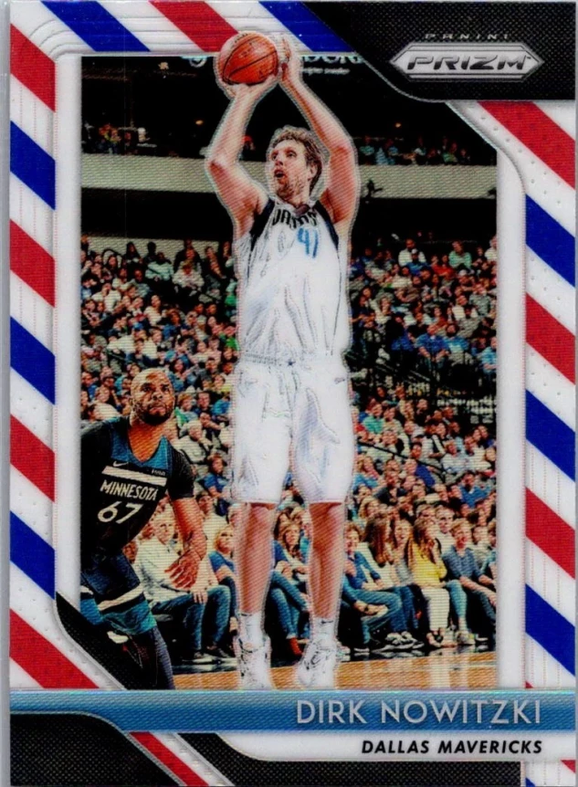 This is a nice example of a 2018-19 Panini Prizm #2 Dirk Nowitzki Prizms Red White and Blue