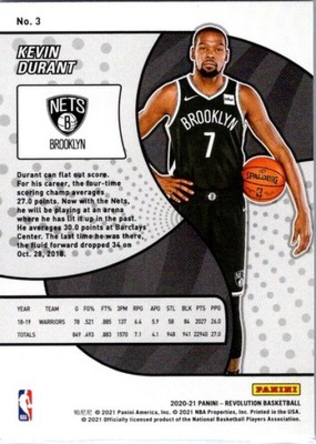 This is a nice example of a 2020-21 Panini Revolution #3 Kevin Durant