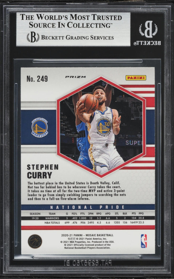 The product is a 2020 Panini Mosaic Reactive Orange Prizm Stephen Curry #249 trading card with a BGS 9 MINT grade. This basketball sports trading card is part of the 2020 Panini Mosaic set and features Stephen Curry as the player. The card is certified by Panini with certification number 0018423425, making it a valuable and sought-after collectible for basketball fans and card enthusiasts alike.