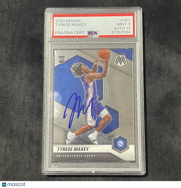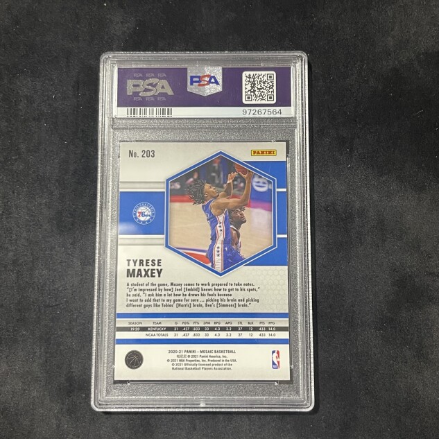 This listing features a 2020-21 Panini Mosaic Basketball #203 Mint 9 Tyrese Maxey, professionally PSA authenticated.
