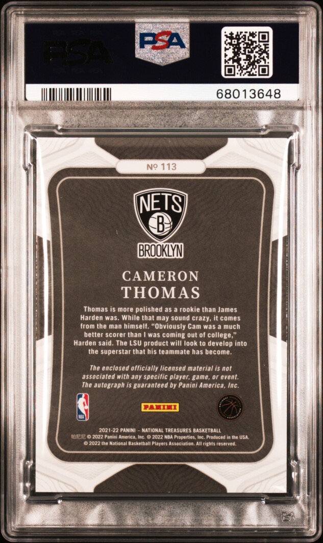 You are purchasing a Cameron Thomas #113 Patch Autograph 96/99 PSA 9. You will receive the exact item in the photographs. Thank you for looking.